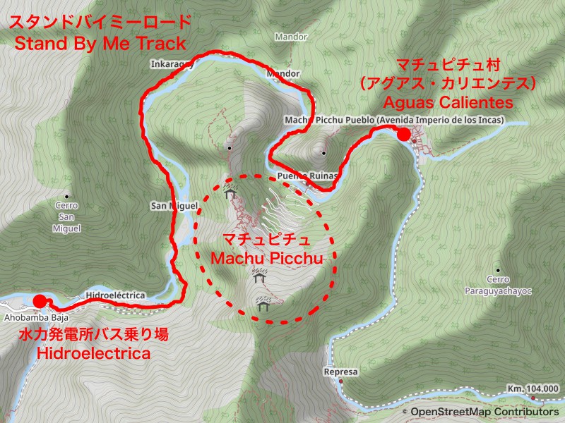 スタンドバイミーロード道はほぼ平坦で、線路に沿ってひたすら続きます。「線路を歩く」というのが映画「Stand by Me」をイメージさせ、「スタンドバイミーロード」と呼ばれています。バス乗り場からマチュピチュ村(アグアス・カリエンテス)までは約10km、約2時間の道のりです。