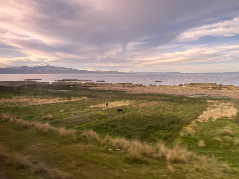 国境が近づくと、車窓からチチカカ湖が見えてきます。チチカカ湖は標高約3,800m、「世界最高所に位置する航行可能な湖」です。特に立ち寄るわけではありませんが、見れただけでも満足。