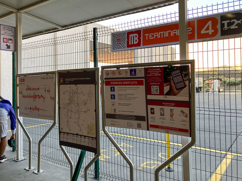 メキシコシティ国際空港の第1ターミナルと第2ターミナルのどちらにも停留所があります。空港の到着ロビーを出ると案内板があり、赤いメトロバスの看板が目印です。